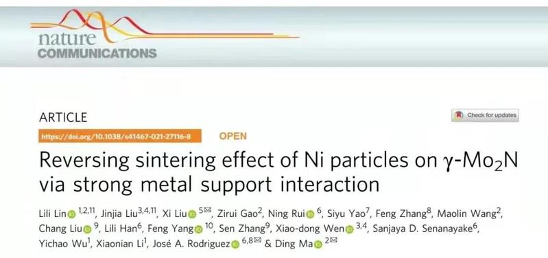 不僅如此,根據(jù)實(shí)驗(yàn)結(jié)果,林麗利發(fā)現(xiàn)逆燒結(jié)過程的發(fā)生不僅改變了金屬的幾何結(jié)構(gòu),還調(diào)變了負(fù)載金屬鎳的電子性質(zhì),改變了金屬鎳在二氧化碳加氫中的“喜好”。因?yàn)閭鹘y(tǒng)的負(fù)載型金屬鎳催化劑是以產(chǎn)物甲烷的生成為主導(dǎo),而在氮化鉬上以2D 薄層分布的金屬鎳催化劑完全失去了生成甲烷的性能,高穩(wěn)定性、高選擇性,實(shí)現(xiàn)了二氧化碳定向轉(zhuǎn)化為一氧化碳。這一成果發(fā)表在最新一期的國際頂級期刊《Nature communications》上。