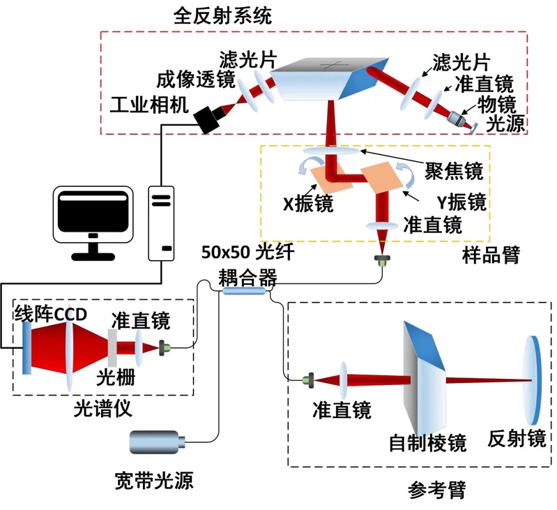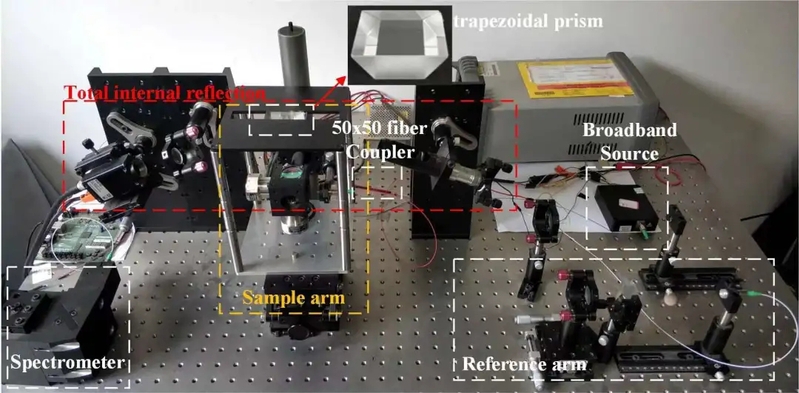 值得一提的是,該系統(tǒng)采用小光斑光纖準(zhǔn)直器和長焦透鏡保證光學(xué)相干層析成像有足夠的面積,采用自制的梯形棱鏡組合TIR和OCT光路,實現(xiàn)相同的測量面積和同步采集。