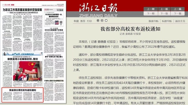 日前,《浙江日報》二版要聞以《我省部分高校發布返校通知》為題,報道我校2022年春節返校工作安排。