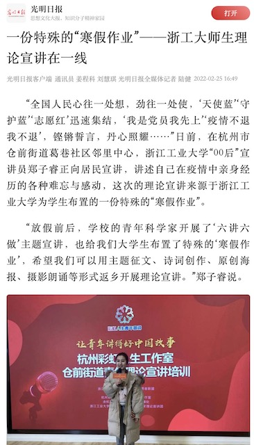 近日,光明日報客戶端以《一份特殊的“寒假作業”——浙工大師生理論宣講在一線》為題,報道我校“青說青聽”青年科學家理論宣講團開展“六講六做”大宣講活動及師生理論宣講的成果。