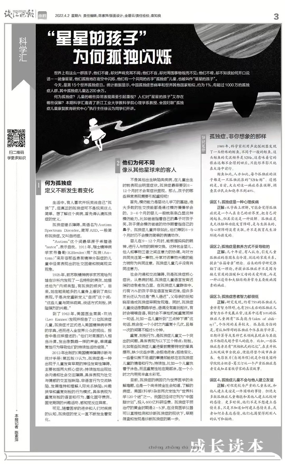 4月2日,我校教育科學與技術學院教授、全國婦聯“孤獨癥兒童康復教育研究中心”執行主任徐云受《錢江晚報》邀請,在科學匯欄目為讀者作孤獨癥知識科普。