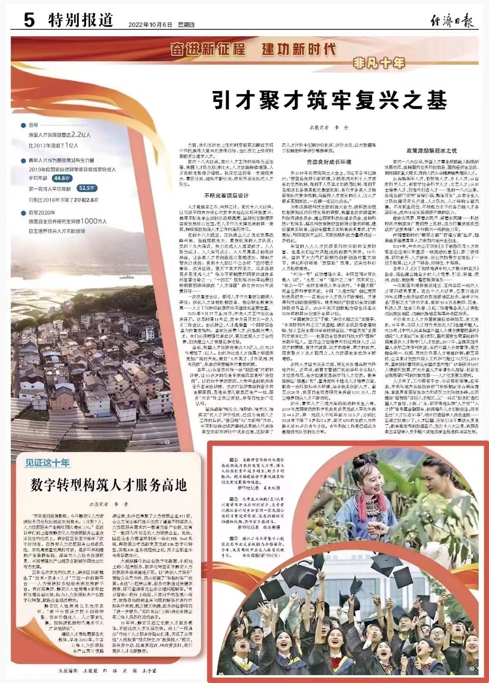 10月6日,《經濟日報》第5版“奮進新征程 建功新時代”特別報道中,綜述了我國十年來人才引育工作,以我校2022屆莫干山校區畢業生合影為新聞圖片,表達要引才聚才筑牢復興之基。