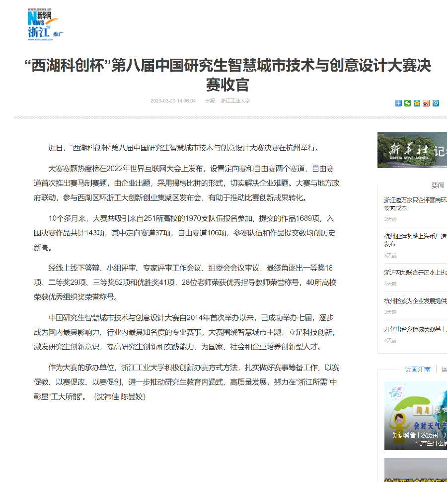 3月20日,新華網(wǎng)以《“西湖科創(chuàng)杯”第八屆中國研究生智慧城市技術(shù)與創(chuàng)意設(shè)計(jì)大賽決賽收官》為題,報(bào)道我校承辦的第八屆中國研究生智慧城市技術(shù)與創(chuàng)意設(shè)計(jì)大賽。