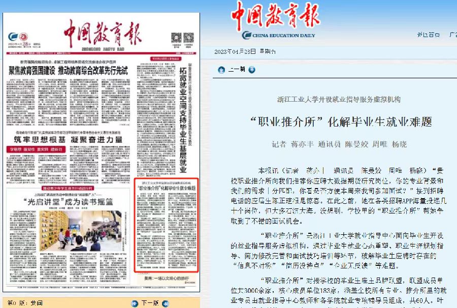 4月28日,中國教育報頭版以《浙江工業大學開設就業指導服務虛擬機構“職業推介所”化解畢業生就業難題》為標題,報道了我校為化解畢業生就業難題實施的創新舉措。