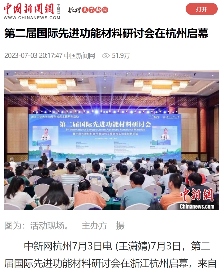 7月3日,中國新聞網客戶端以《第二屆國際先進功能材料研討會在杭州啟幕》為題,報道了我校主辦的第二屆國際先進功能材料研討會。