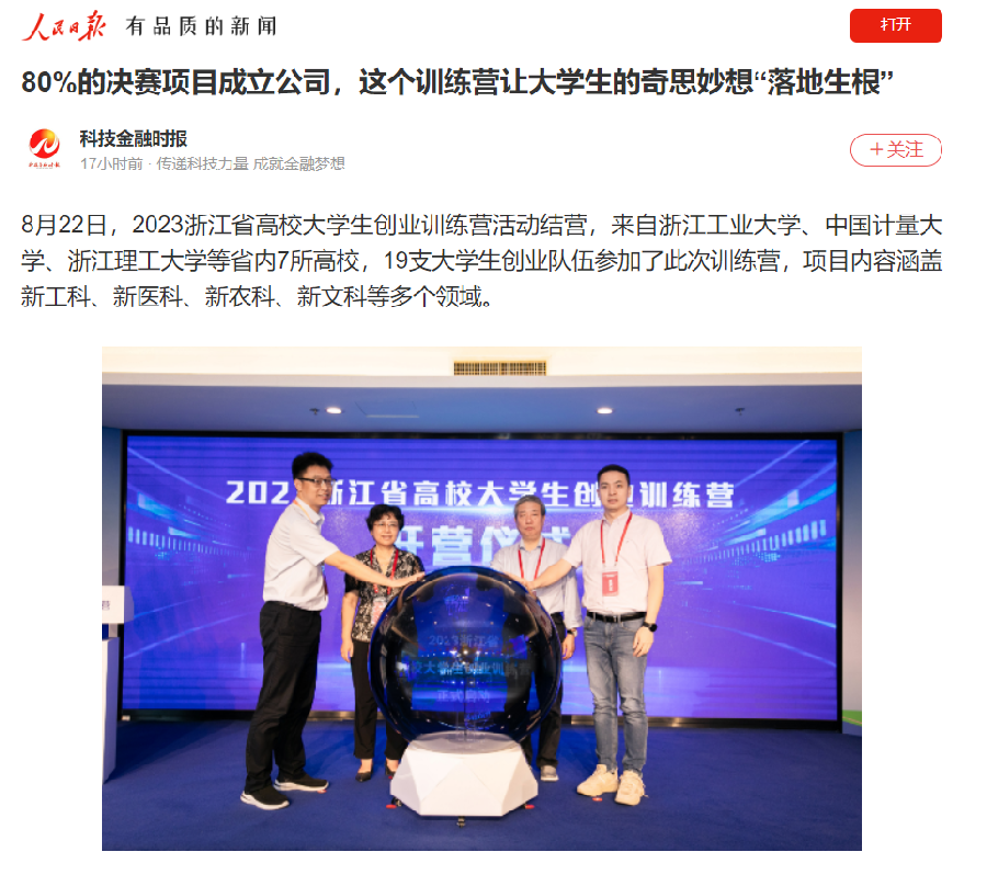 8月22日,人民日報客戶端以《80%的決賽項目成立公司,這個訓練營讓大學生的奇思妙想“落地生根”》為主題,報道了我校學生參加2023浙江省高校大學生創業訓練營,在訓練營中開展創業實踐鍛煉。