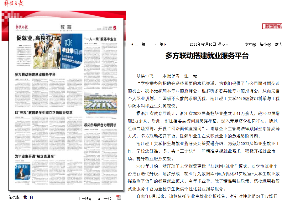 8月26日,《科技日報》第五版以《多方聯動搭建就業服務平臺》為主題,報道了我校實施多項舉措,線上線下雙邊聯動搭建畢業生就業服務平臺。