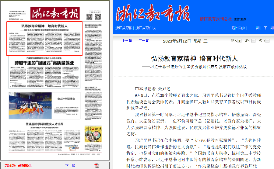 9月12日,《浙江教育報》頭版頭條以《弘揚教育家精神 培育時代新人——習近平總書記致信全國優秀教師代表引發浙江教師熱議》為主題,報道了我校催化教師團隊獲評第三批“全國高校黃大年式教師團隊”,展現和弘揚的教育家精神。