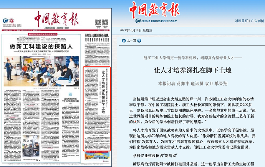 10月18日,《中國教育報》頭版以《浙江工業(yè)大學錨定一流學科建設,培養(yǎng)復合型專業(yè)人才——讓人才培養(yǎng)深扎在腳下土地 》為主題,報道了我校將人才培養(yǎng)扎根國家戰(zhàn)略和地方需求,培養(yǎng)社會真正需要的復合型人才。
