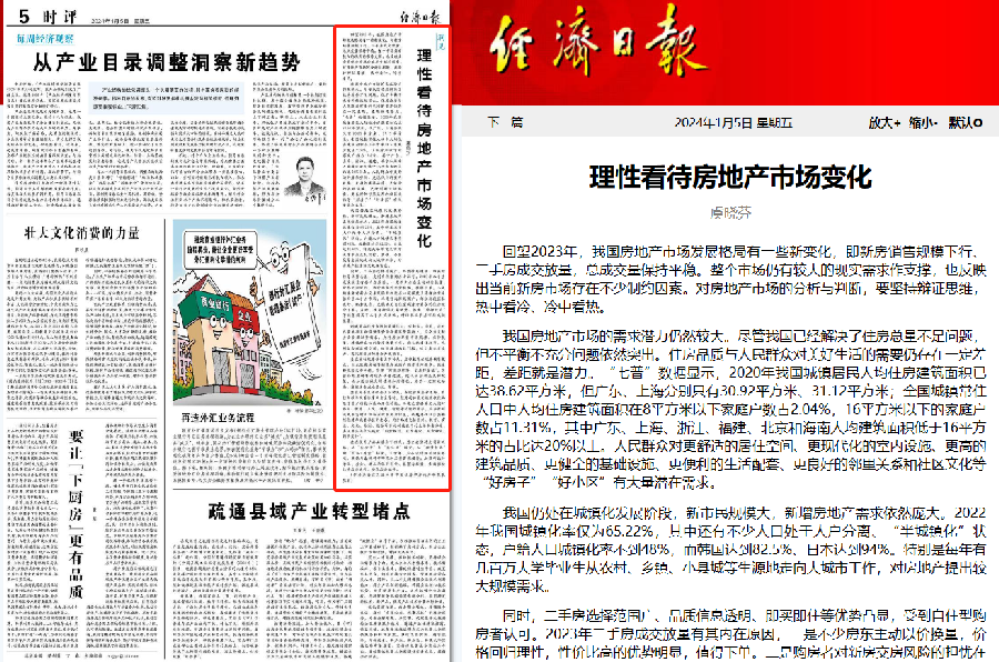 1月5日,《經濟日報》刊登我校副校長、中國住房和房地產研究院院長虞曉芬教授署名文章《理性看待房地產市場變化》。文章中,虞曉芬就房地產市場發展格局的相關變化發表觀點。