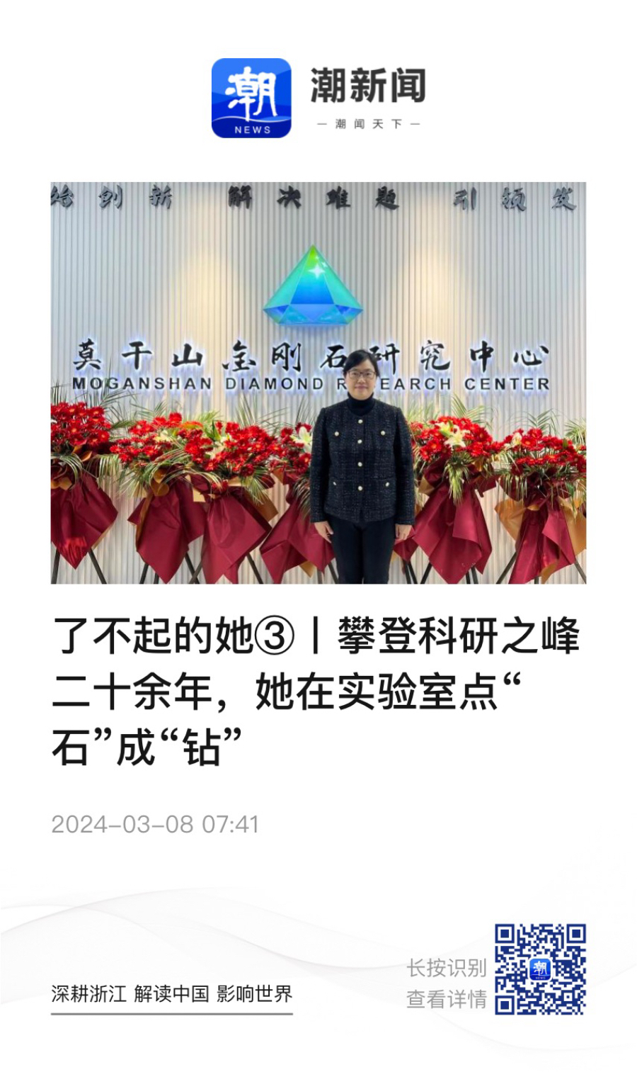 3月8日,潮新聞“了不起的她”專題系列,報道浙江工業大學材料科學與工程學院副院長胡曉君教授深耕金剛石領域,攀登科研之峰。