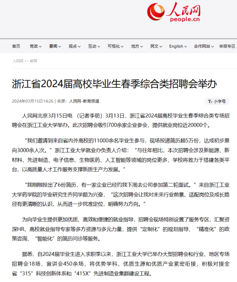3月15日,人民網報道浙江省2024屆高校畢業生春季綜合類專場招聘會在浙江工業大學舉辦。本次招聘會吸引700余家企業參會,提供就業崗位近20000個。