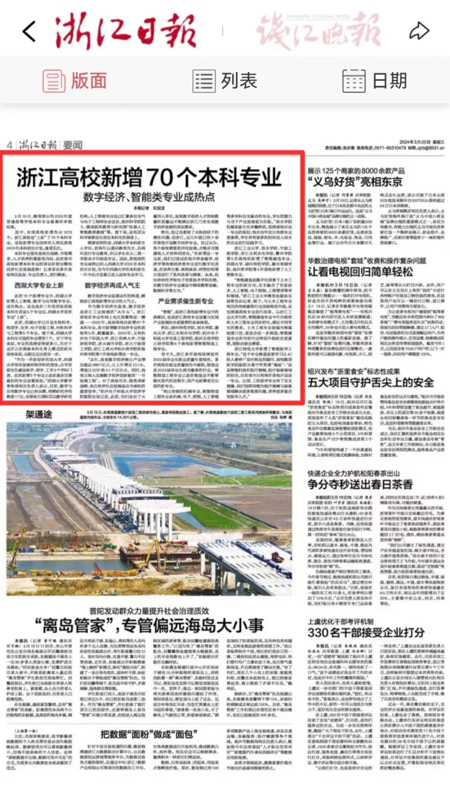 3月20日,《浙江日報》以《浙江高校新增70個本科專業 數字經濟、智能類專業成熱點》為題報道浙江高校新增本科專業,浙江工業大學教務處副處長湯智接受采訪,談數字化背景下我校專業數字化、智能化轉型升級。