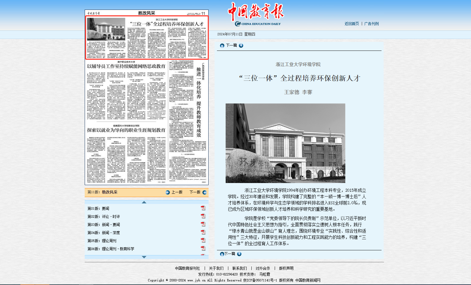 7月11日,《中國教育報》第11版以《“三位一體”全過程培養(yǎng)環(huán)保創(chuàng)新人才》為題,報道我校環(huán)境學院從“深耕育人體系”“深化育人路徑”“創(chuàng)新育人平臺”等三個維度卓越開展全過程人才培養(yǎng)工作。