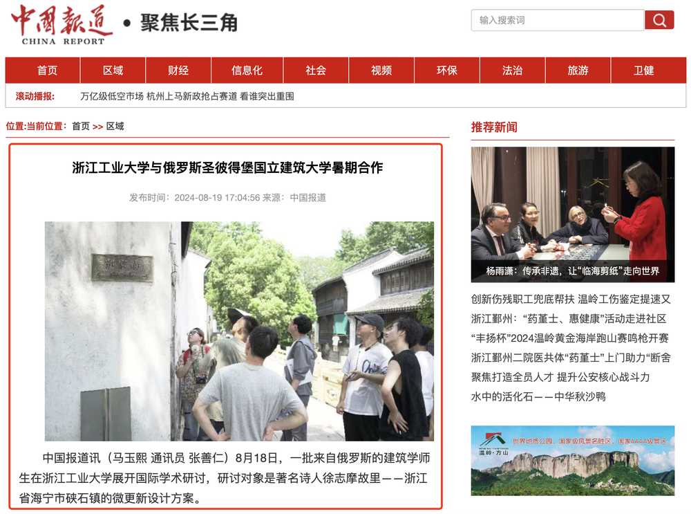 8月19日,中國報道網報道我校與俄羅斯圣彼得堡國立建筑大學合作開展國際化課程教學。圣彼得堡國立建筑大學教授Ushakova Olga與助教Parshentseva Arina來到浙江,開展為期三周的授課。共同研討著名詩人徐志摩故里——浙江省海寧市硤石鎮的微更新設計方案。