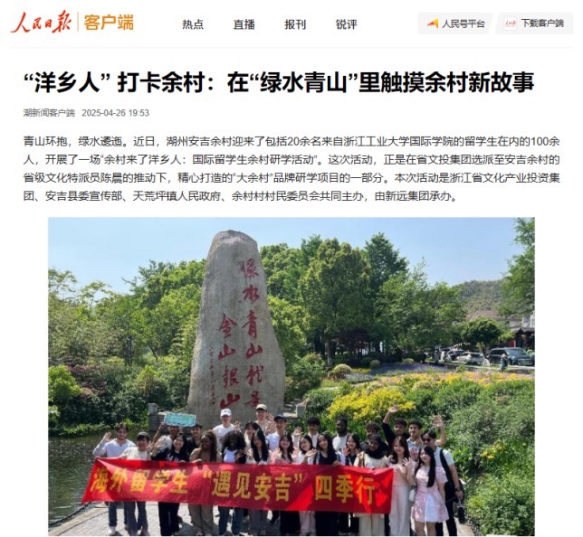 4月26日,《人民日報》客戶端以《“洋鄉人” 打卡余村:在“綠水青山”里觸摸余村新故事》為題,報道我校國際學院20余名留學生到湖州安吉余村,開展了一場“余村來了洋鄉人:國際留學生余村研學活動”。